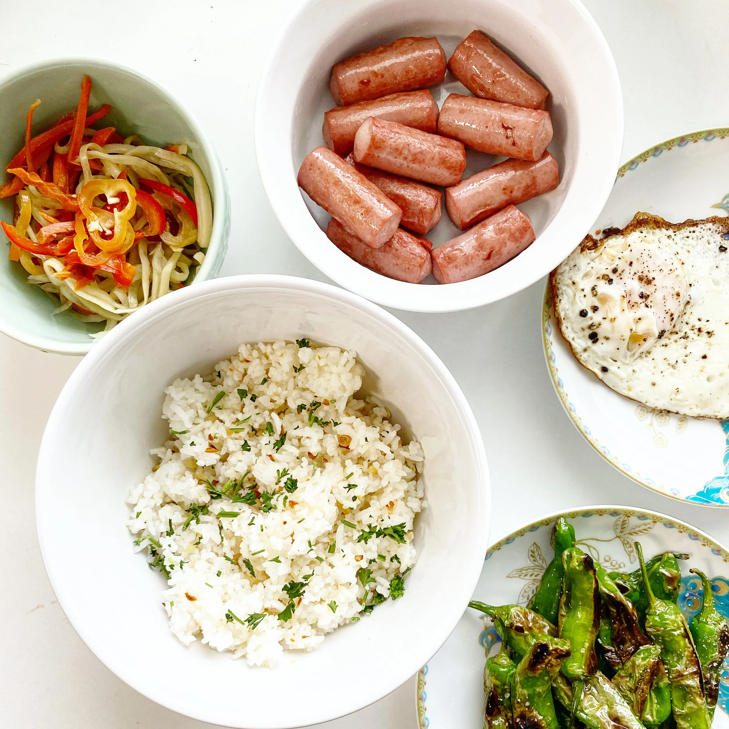 breakfast: sinangag (garlic fried rice), atchara (pickled papaya and carrots, vienna sausage, fried egg, shishito peppers.