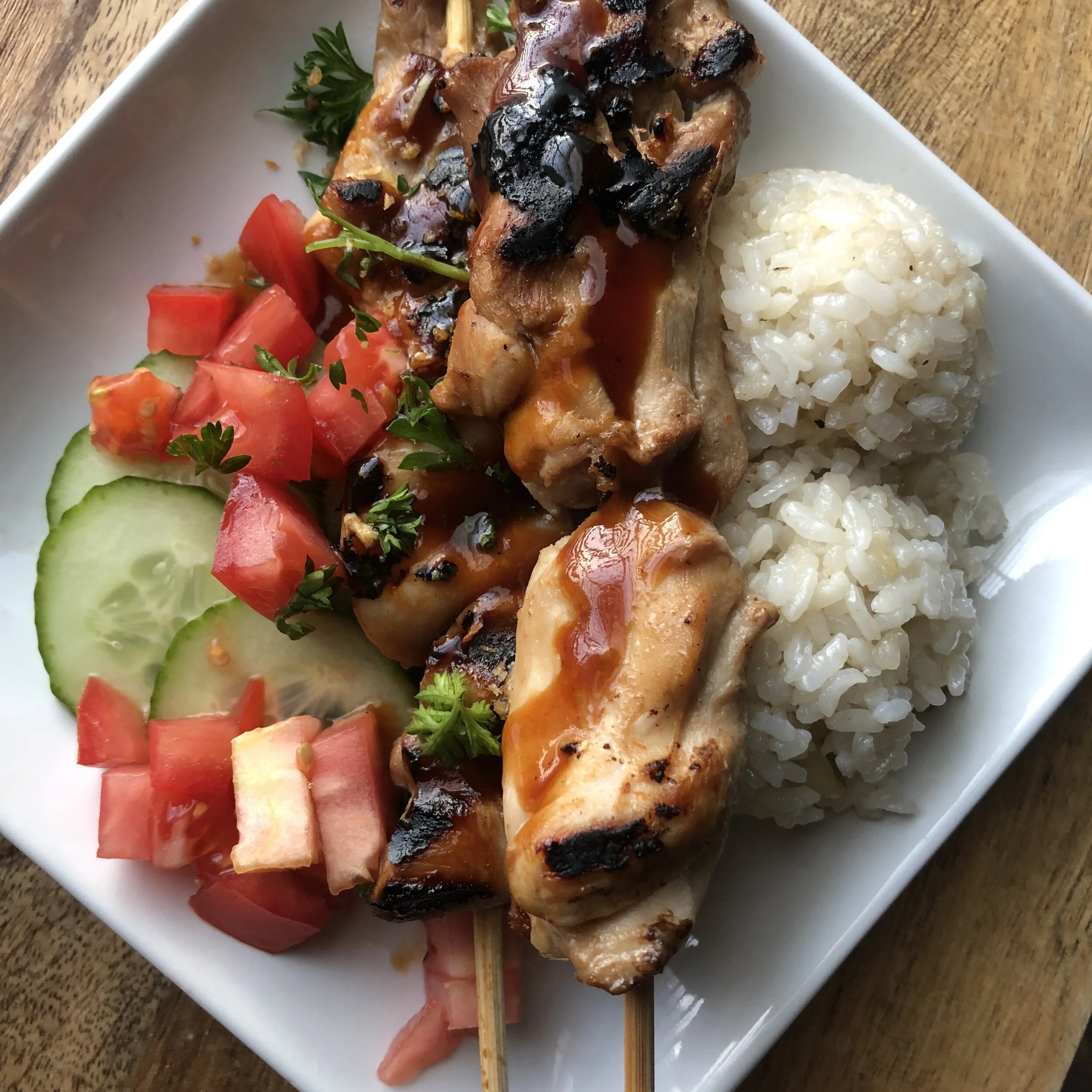 grilled chicken on a stick, pickled cuckes and tomatoes, sinangag (garlic fried rice).