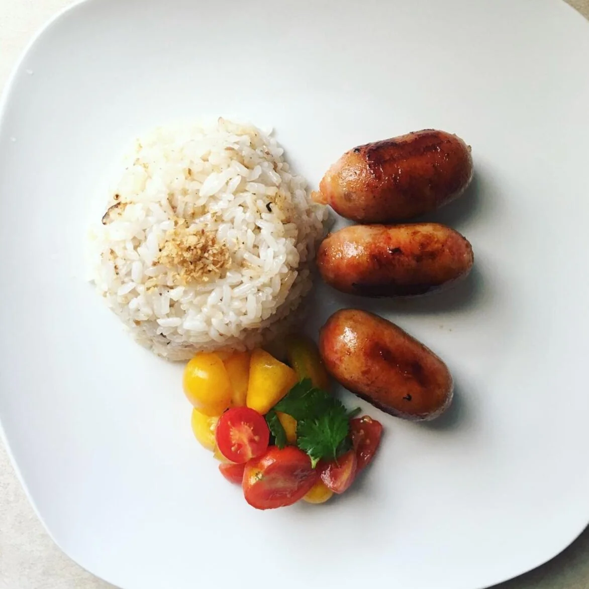 sinangag (garlic fried rice), chicken logganisa (cured chicken sausage), tomatoes with soy sauce.